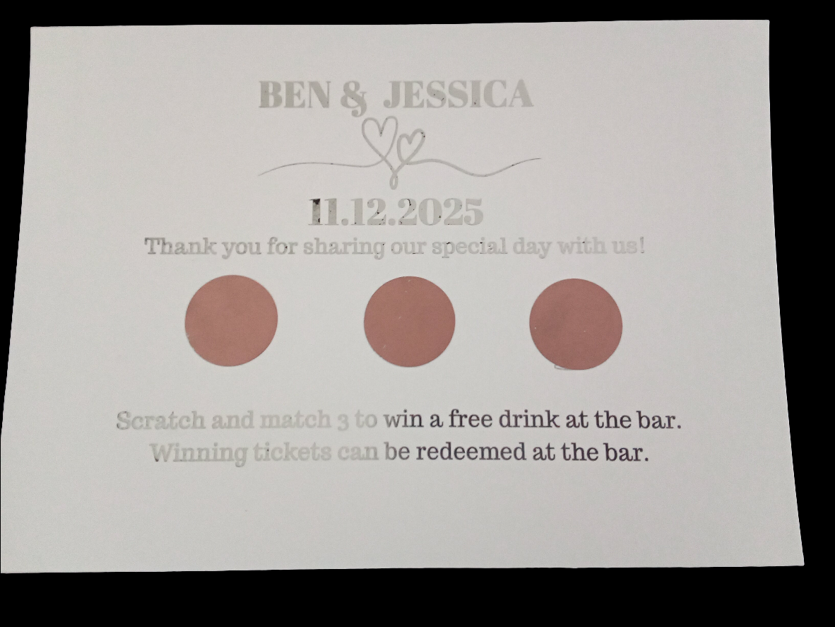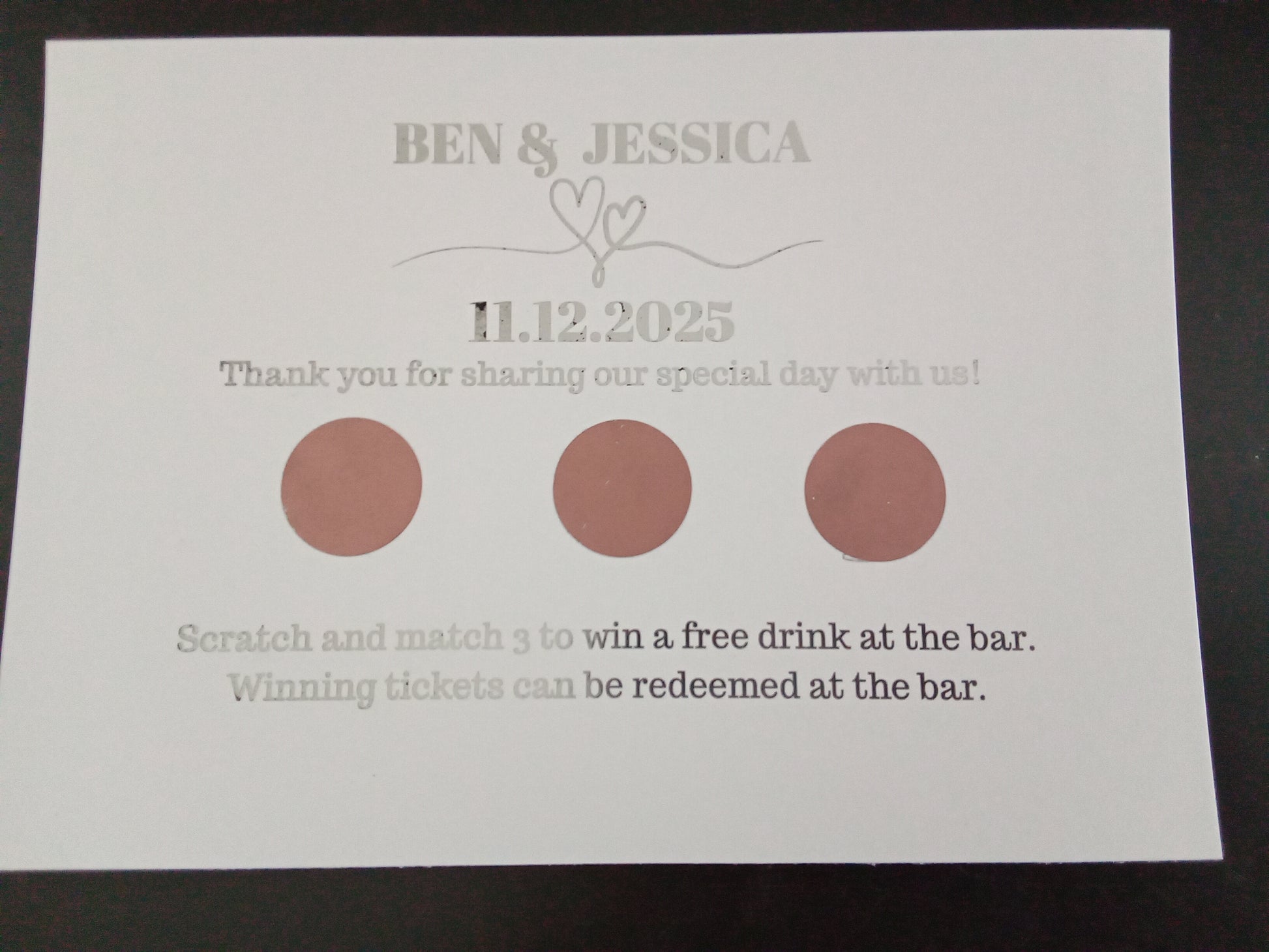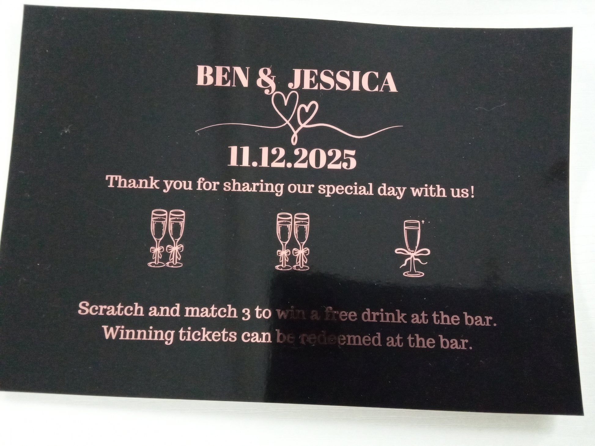 Scratch off Wedding favours are the perfect fun way to give a favour at your wedding, no more left behind favours, can be on black or white card, and we have a range of different coloured foils. "Enhance your wedding experience with our Scratch off Wedding Favours. Leave behind the worry of forgotten favours with our fun, customizable option. Available in both black and white card, with a variety of foil colours to choose from. Make your wedding unforgettable with Scratch off Wedding Favours." Please email with Bride and Groom Names, Date, Quantity of wins, Quantity of losers.